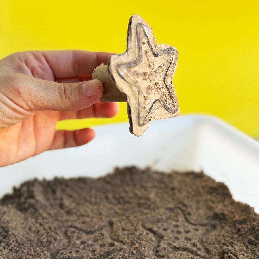 - Sellos caseros: con un trocito de cartón como base, un trozo de tubo (de papel higiénico o film de cocina) como mango, y figuras dibujadas con pistola de pegamento caliente. Al final del descargable de "busca y encuentra" encontrarás seis dibujos muy sencillos listos para usar como plantilla. ¡Una forma divertida y personalizada de crear huellas sobre la arena! Si necesitas una cortadora de cartón para hacer proyectos como estos, te súper recomiendo la que yo tengo. ¡No habrá cartón que se te resista, y sin dejarte los dedos!