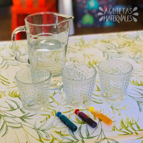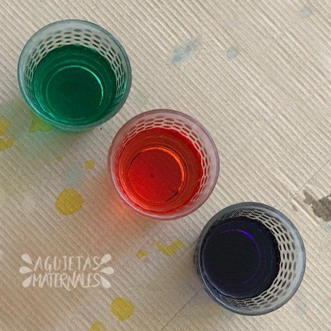 Con un par de gotas se tiñe el agua de un vaso. Si se echa demasiado colorante, el color será tan denso que parecerá negro. Así que un par de gotas de cada tono por vaso para que se vea bien la actividad y cómo cambian los colores al mezclarlos.