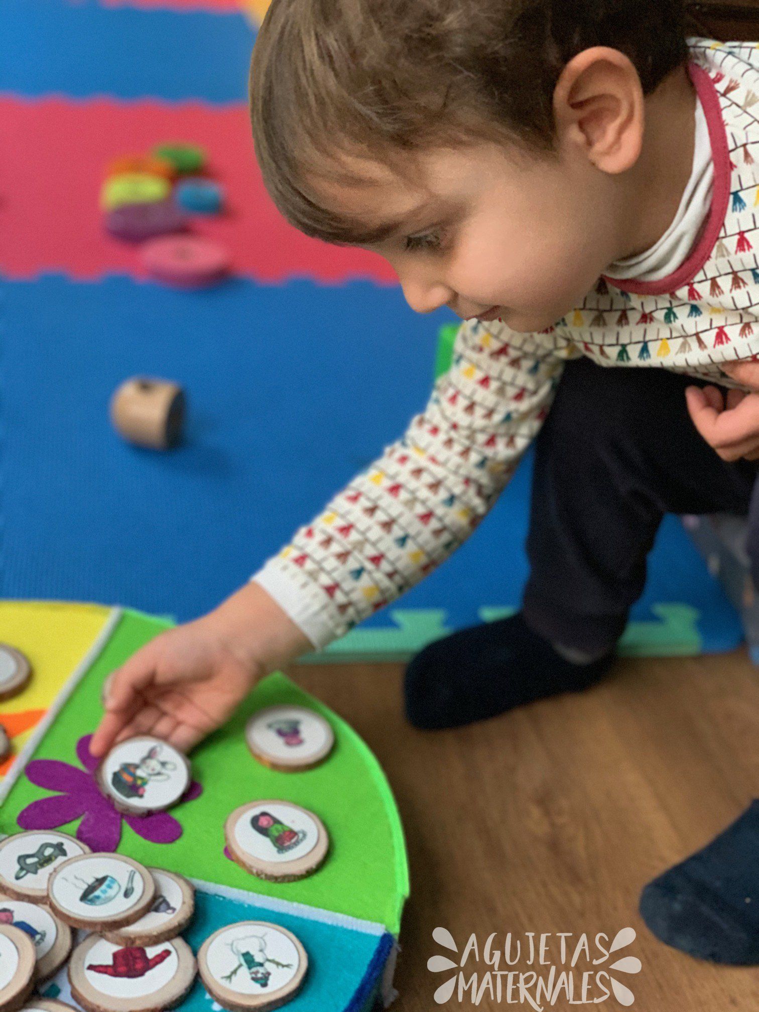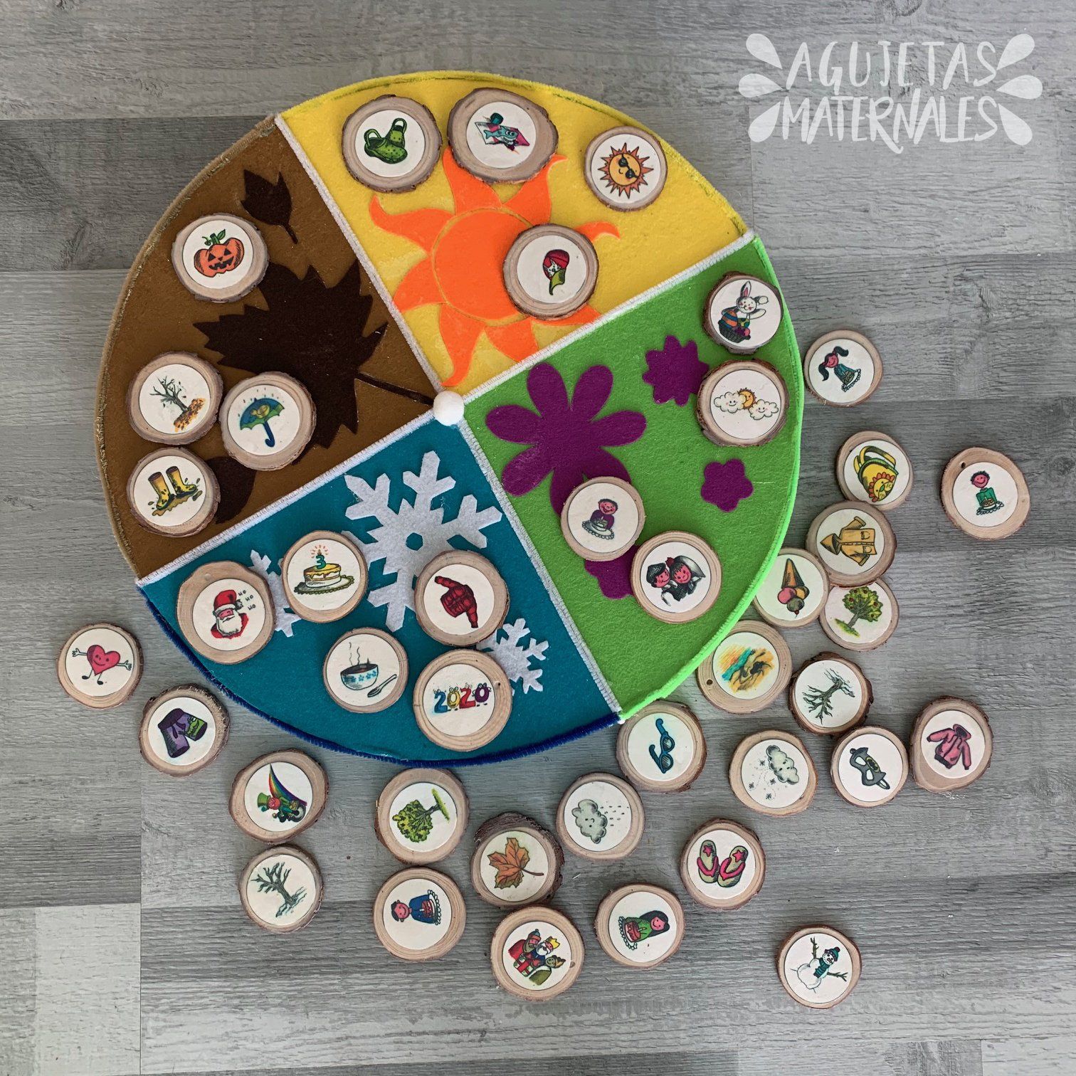 A mi hijo le encanta el juego. Le voy dando las piezas una a una, las vamos comentando y él las coloca en la estación que corresponde. Le gusta tanto jugar que a veces se quiere incluso ir a dormir con las fichas de lo que le gustan. Poco a poco va aprendiendo que hay cosas que pasan en determinados momentos del año, en los cuales las condiciones meteorológicas con particulares,