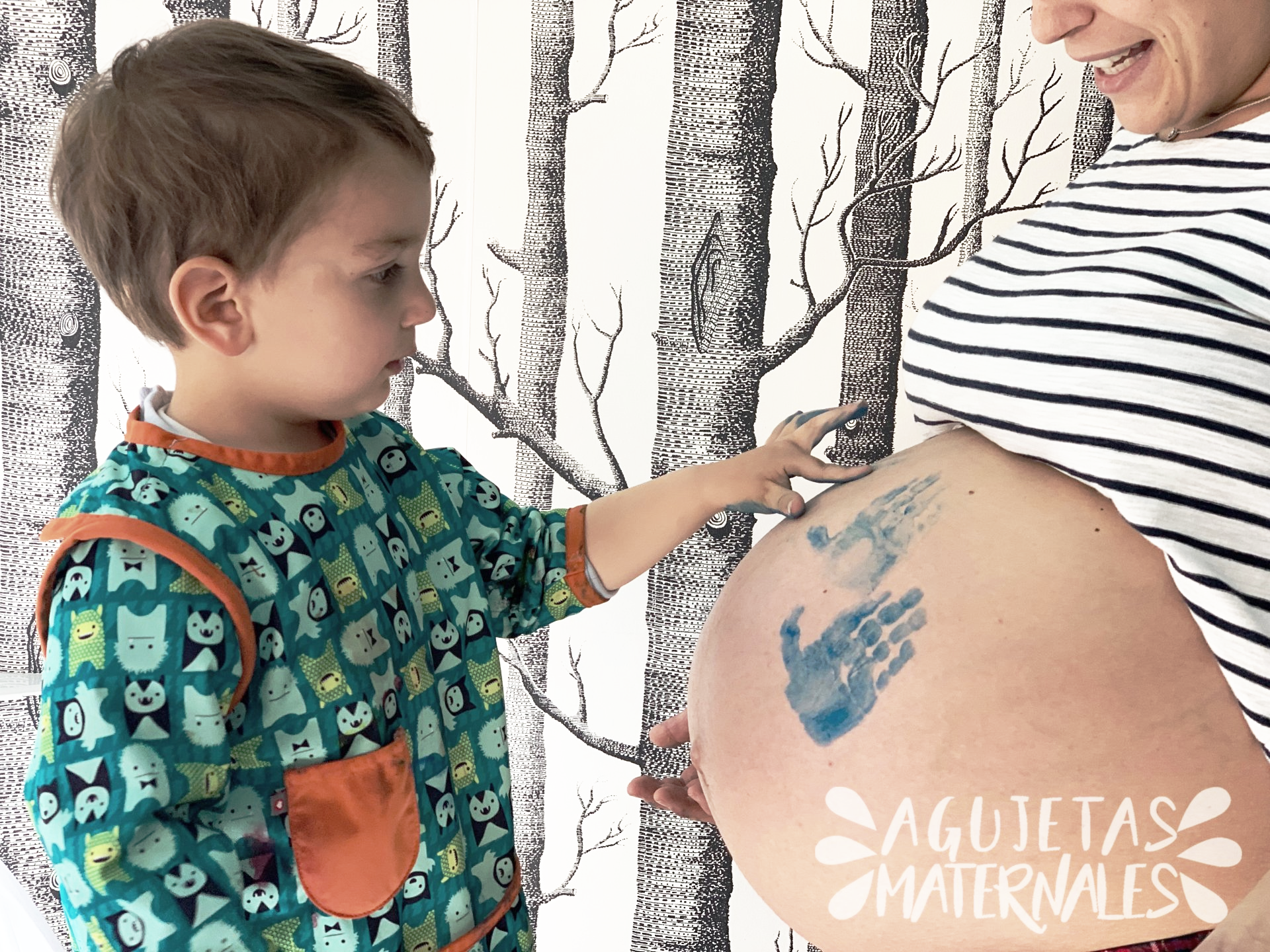 La que está preñadísima en esta foto soy yo, Nai. El enano que me estampa sus manos pringadas en pintura azul es mi amorcete primogénito, Torpedín. Le llamamos cariñosamente así, Torpedo, porque es pura energía. No para quieto ni un minuto. Ha sido así desde que nació. ¡Tenía demasiado mundo por conocer para hacerlo tranquilamente!