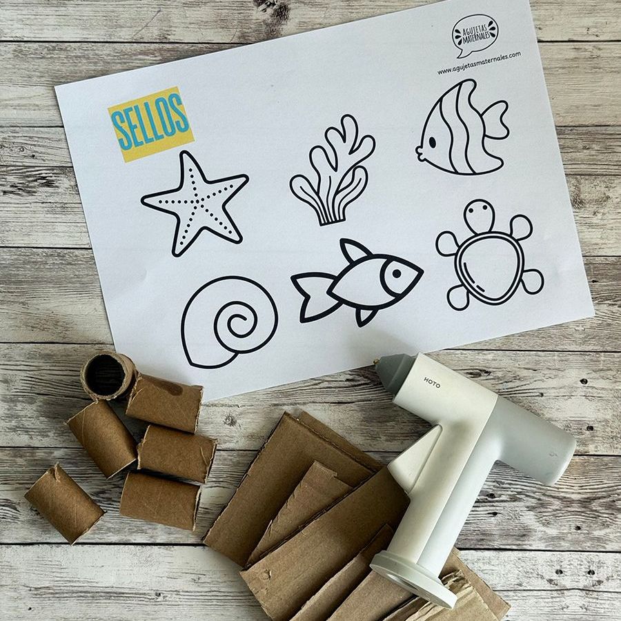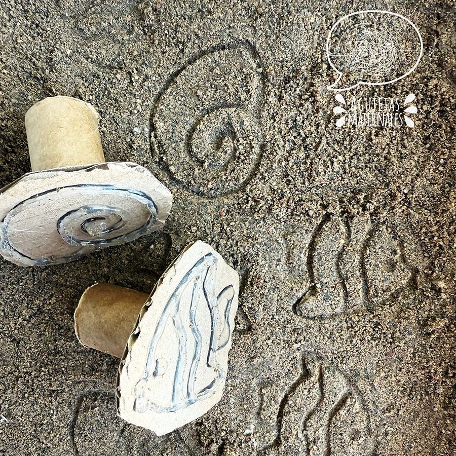 - Sellos caseros: con un trocito de cartón como base, un trozo de tubo (de papel higiénico o film de cocina) como mango, y figuras dibujadas con pistola de pegamento caliente. Al final del descargable de "busca y encuentra" encontrarás seis dibujos muy sencillos listos para usar como plantilla. ¡Una forma divertida y personalizada de crear huellas sobre la arena! Si necesitas una cortadora de cartón para hacer proyectos como estos, te súper recomiendo la que yo tengo. ¡No habrá cartón que se te resista, y sin dejarte los dedos!