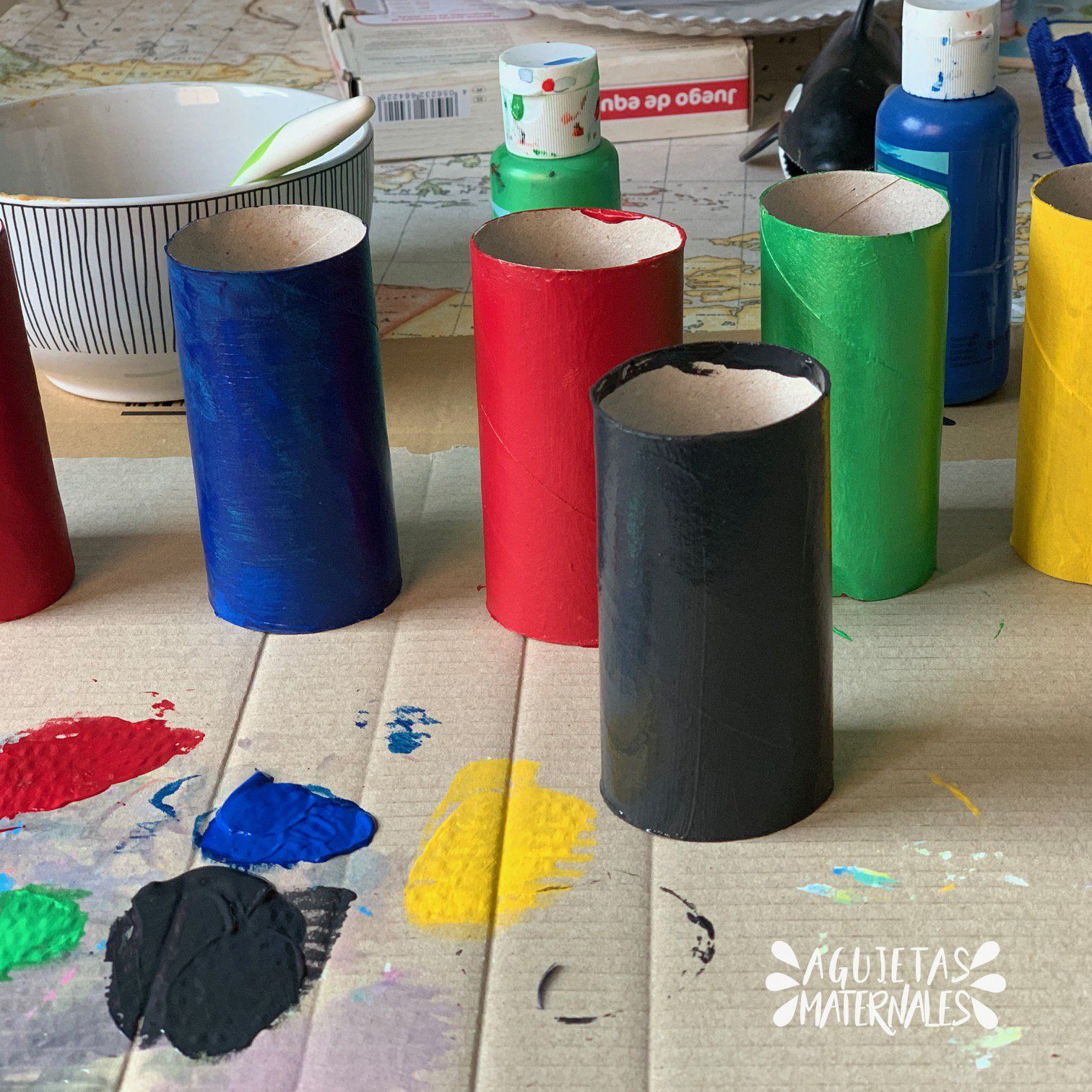 para no manchar la ropa. Da igual que pintes con témpera o con acrílico. Sobre el cartón del rollo de papel higiénico cogen todos los materiales.
