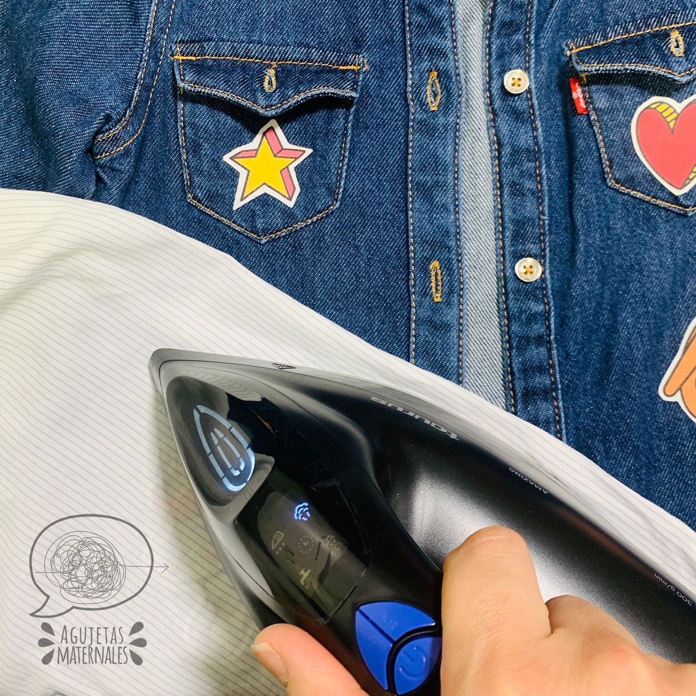 30-40 segundos encima de cada parche moviendo un poco y ejerciendo algo de presión. Luego volvimos a fijar por el reverso de la prenda aplicando calor de nuevo.