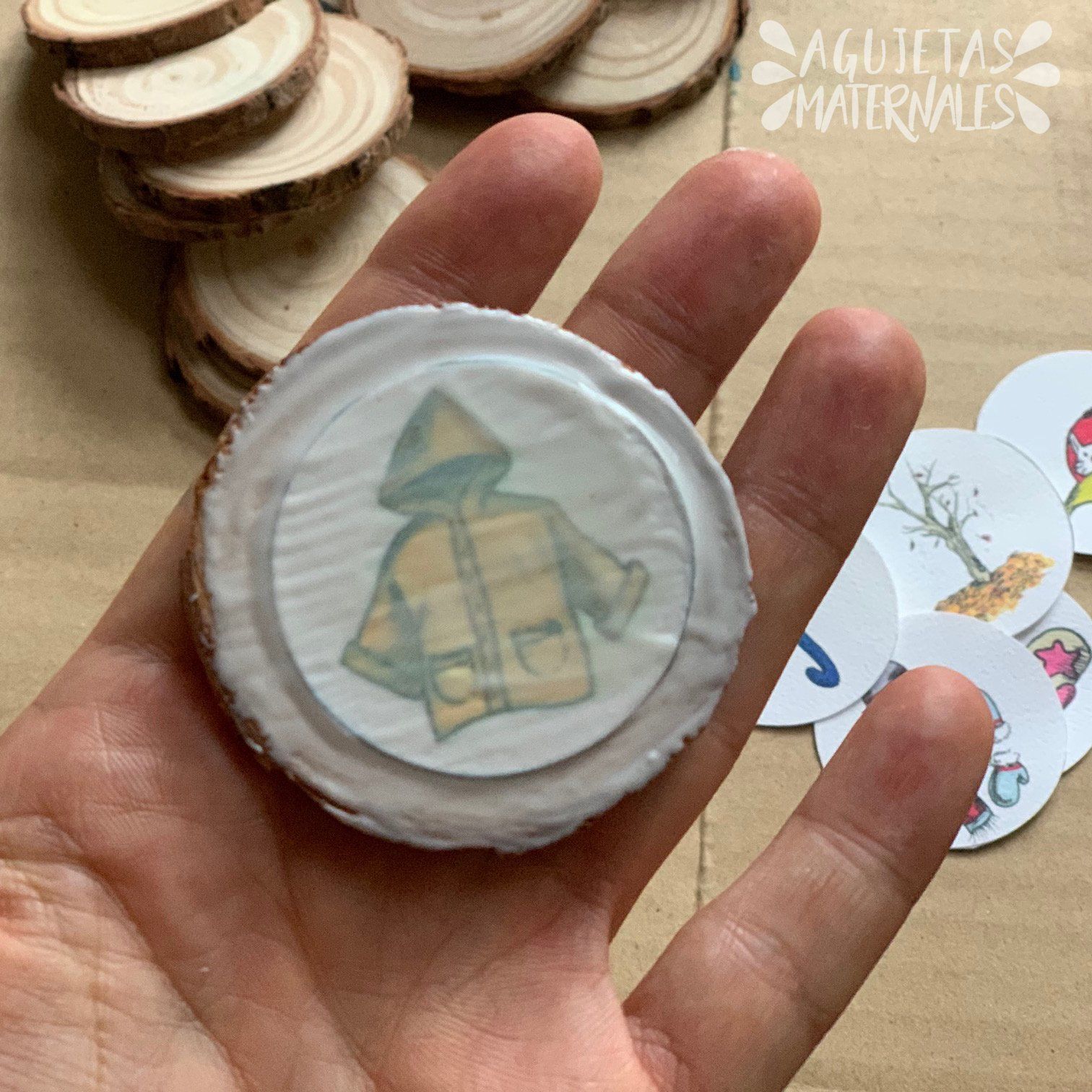 Recorta los círculos y pégalos en círculos de cartón un poco más grandes o en fichas de madera (las encontré en un bazar chino pero Amazon también las vende).