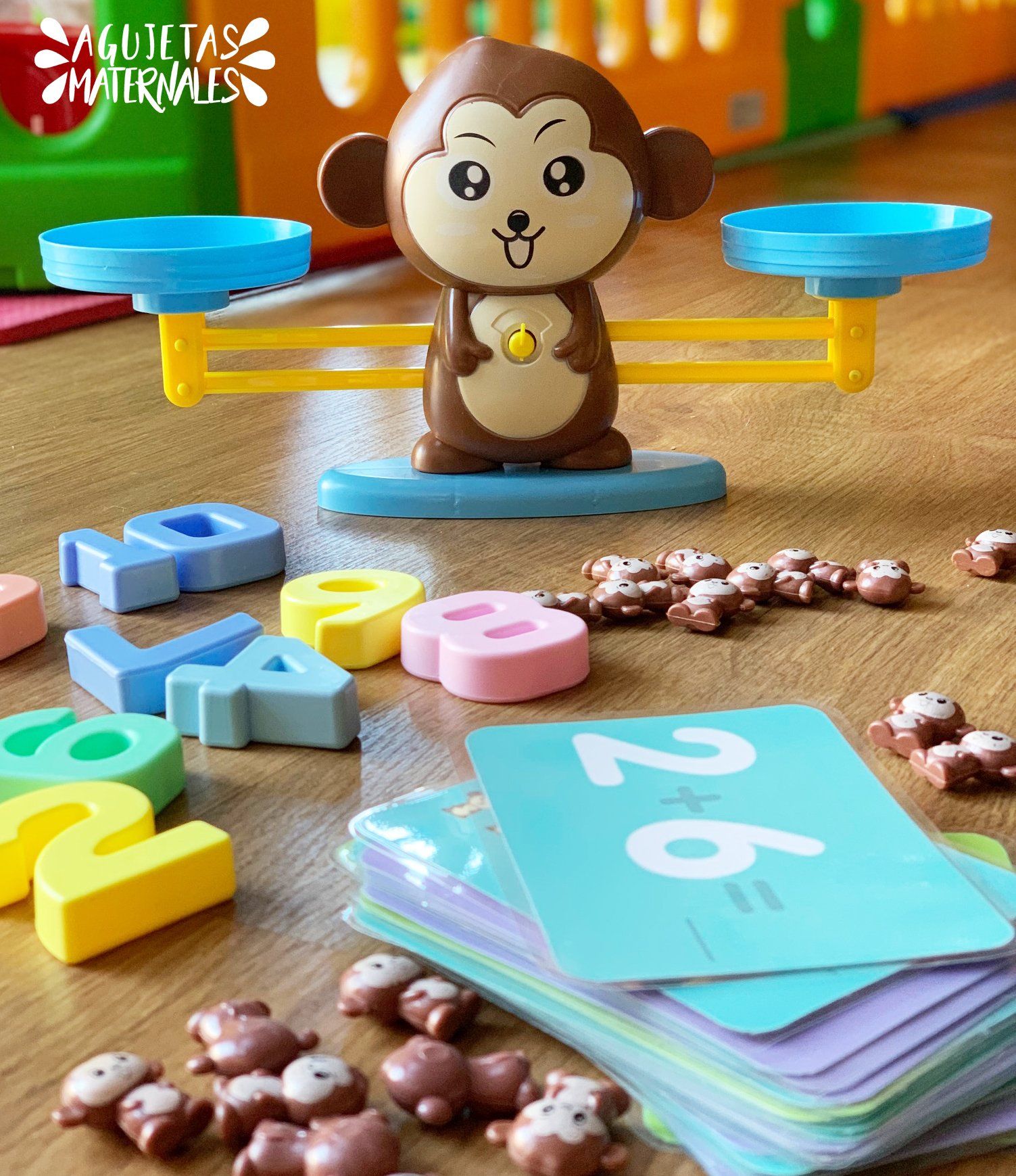 Si pone un 3 en un lado de la balanza y 3 monitos en el otro lado, la balanza se equilibra. Si ahora añades en un lado el número 1, se equilibra si en el otro añades un monito. Es genial porque lxs niñxs aprenden de manera manipulativa, tocando con sus manos, el concepto de las magnitudes que representan los números. También es genial para que interioricen los conceptos de suma y resta.