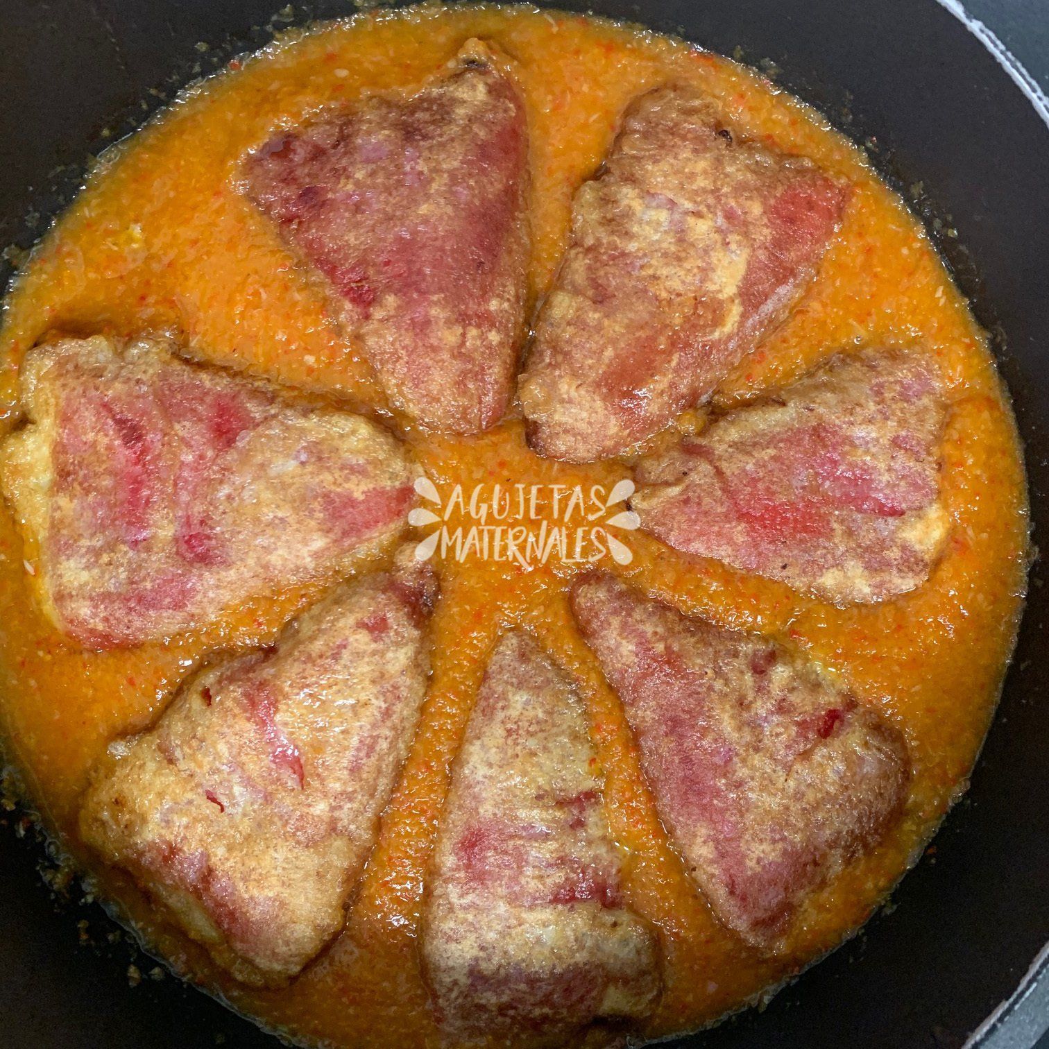 - Ve poniendo los pimientos en la cazuela con salsa que habías preparado.