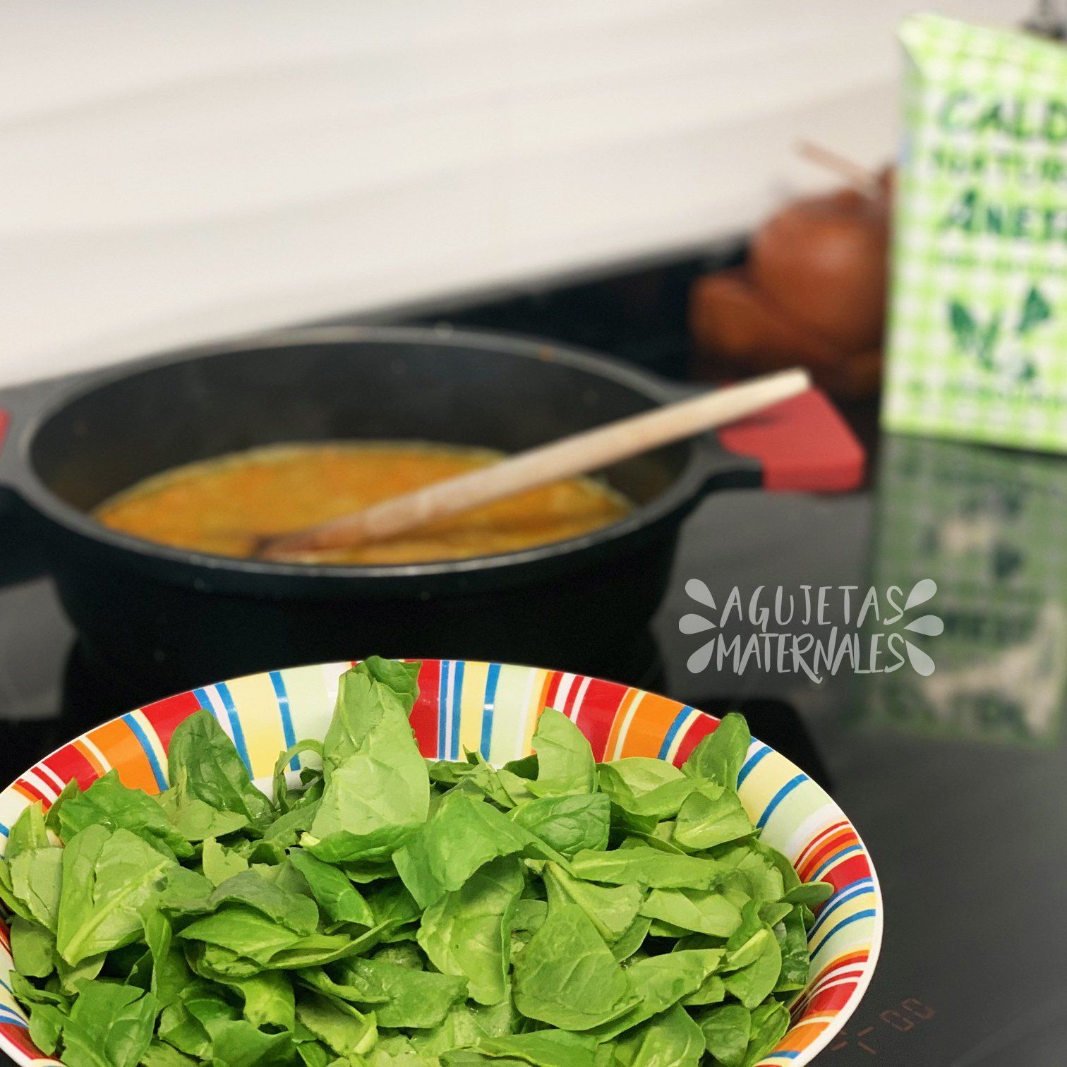 - Añade los garbanzos y las espinacas y añade otros 200 ml de caldo de verduras 100% natural Aneto. Rehoga 10 minutos hasta que las espinacas se integren un poco con el caldo.