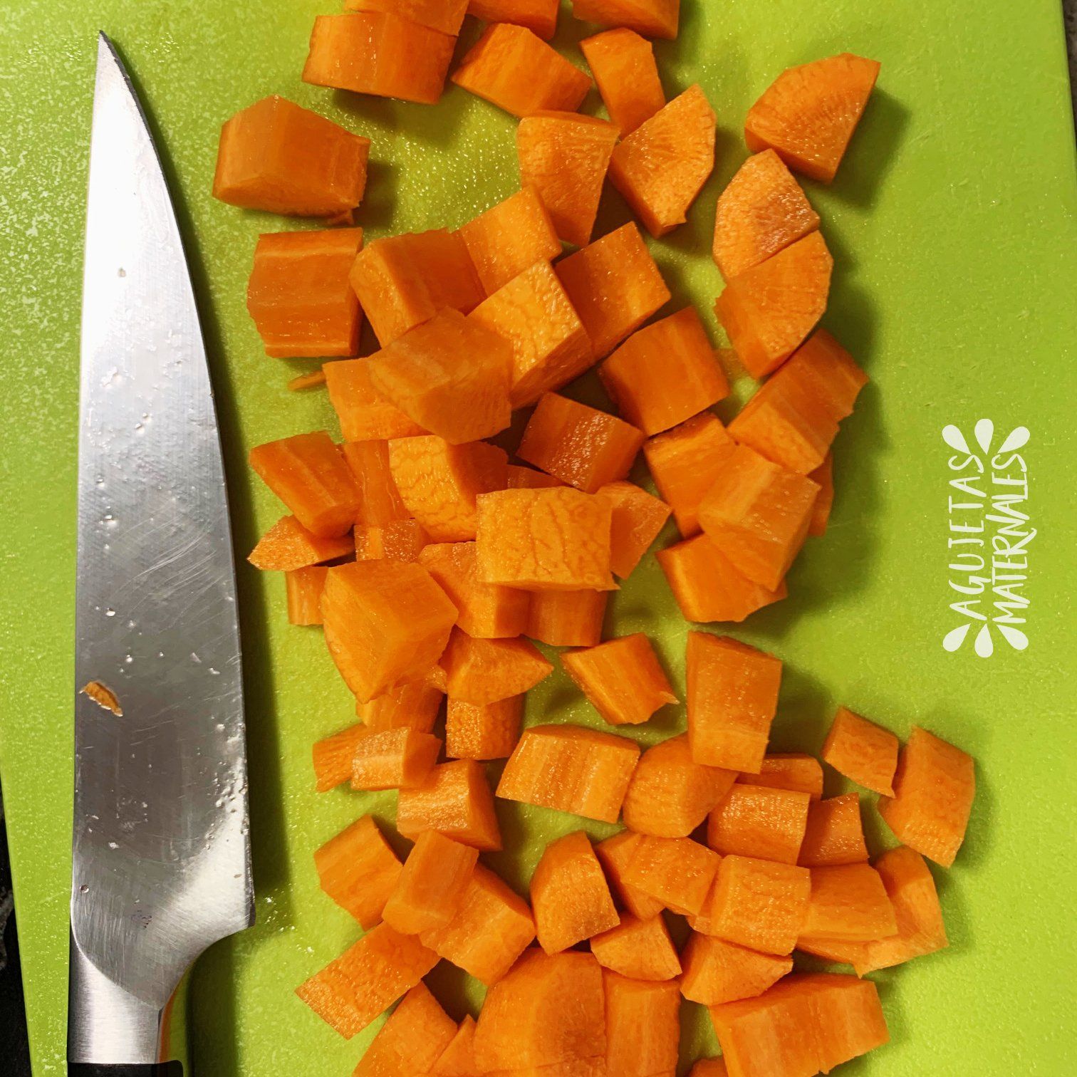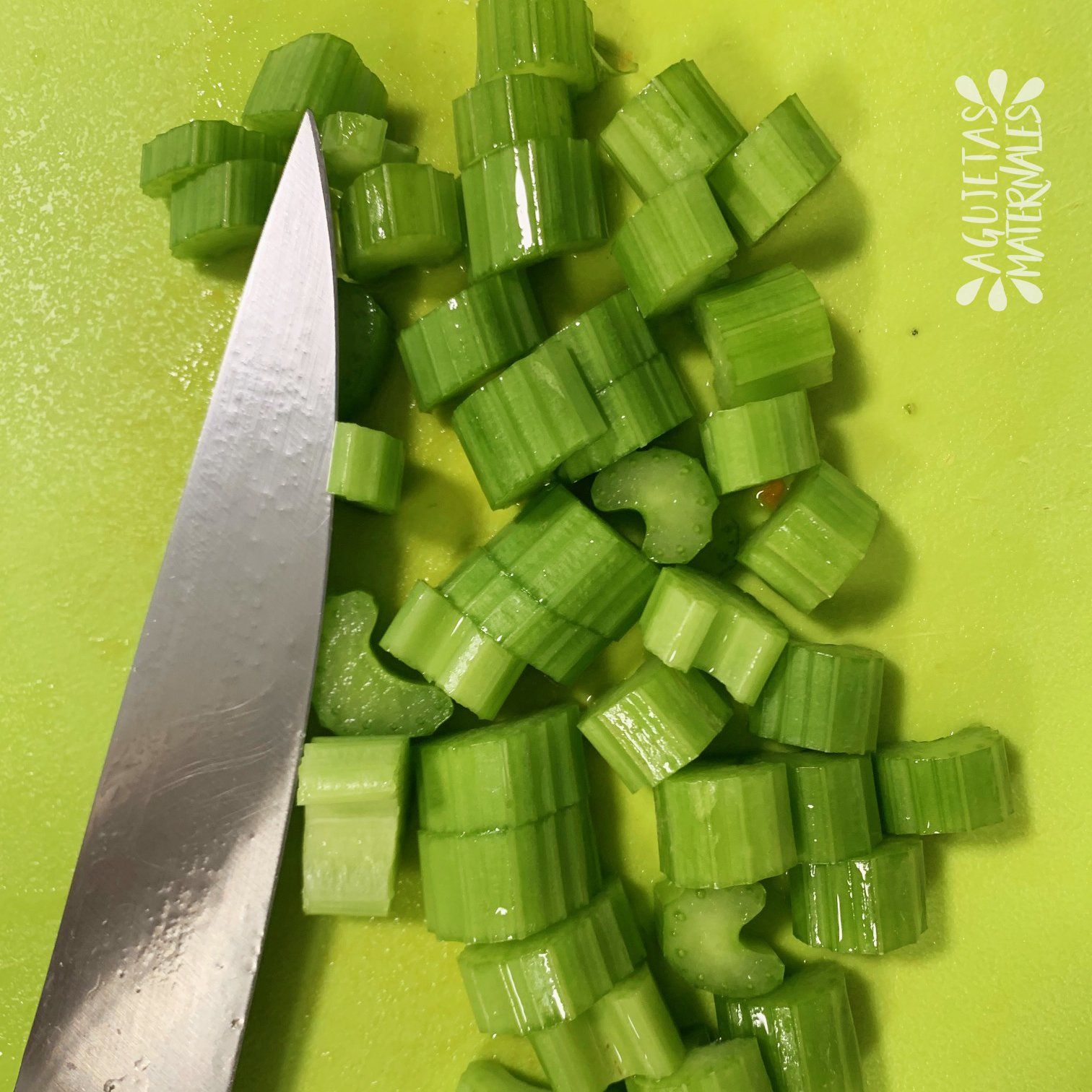 - Pela, lava y corta las cebollas, las zanahorias y las ramas de apio